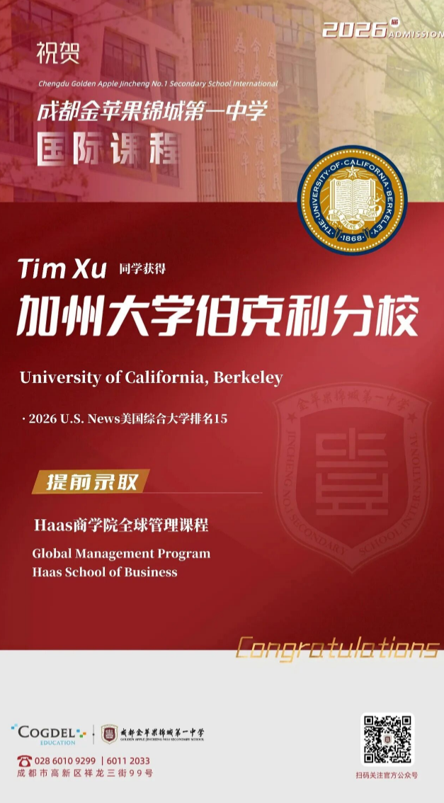 A student from the International Curriculum Program of Chengdu Golden Apple Jincheng No.1 High School, operated jointly by Cogdel Education Group and Golden Apple Education Group, has received an early admission offer to the prestigious Global Management Program (GMP) at the Haas School of Business, University of California, Berkeley (UC Berkeley) — one of the world’s most elite business programs.