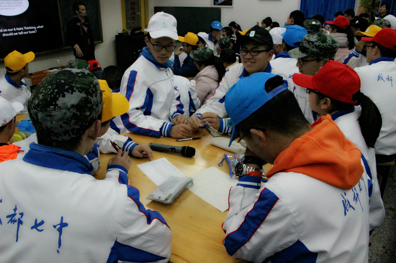 在课程开始时,John引入并介绍了由爱德华·德博诺博士研发的思维训练工具——“六顶思考帽”(6 Thinking Hats),它是锻炼学生“平行思维”的一种工具,并可以使学生有效避免将时间浪费在互相争执上。在公开课中,John引导学生利用“六顶思考帽”探讨如何利用网络游戏来解决环境污染问题。两个看似不相关的概念在John风趣幽默的语言引导下变得不再相隔遥远,学生们也慢慢地将思维发散开来,每个人都在不同的角色定位中积极寻找着解决办法。