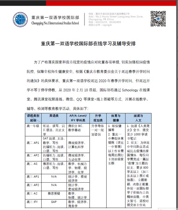 重庆第一双语学校国际部为严格贯彻落实停课不停学的相关规定,将通过各种方式开展在线教学、辅导、检测等教学活动。同时,升学指导部门根据当前局势及时开展线上直播课程及主题讲座,解析留学趋势,帮助学生及家长理性、全面规划选校定位。"Online Courses and Coaching"
