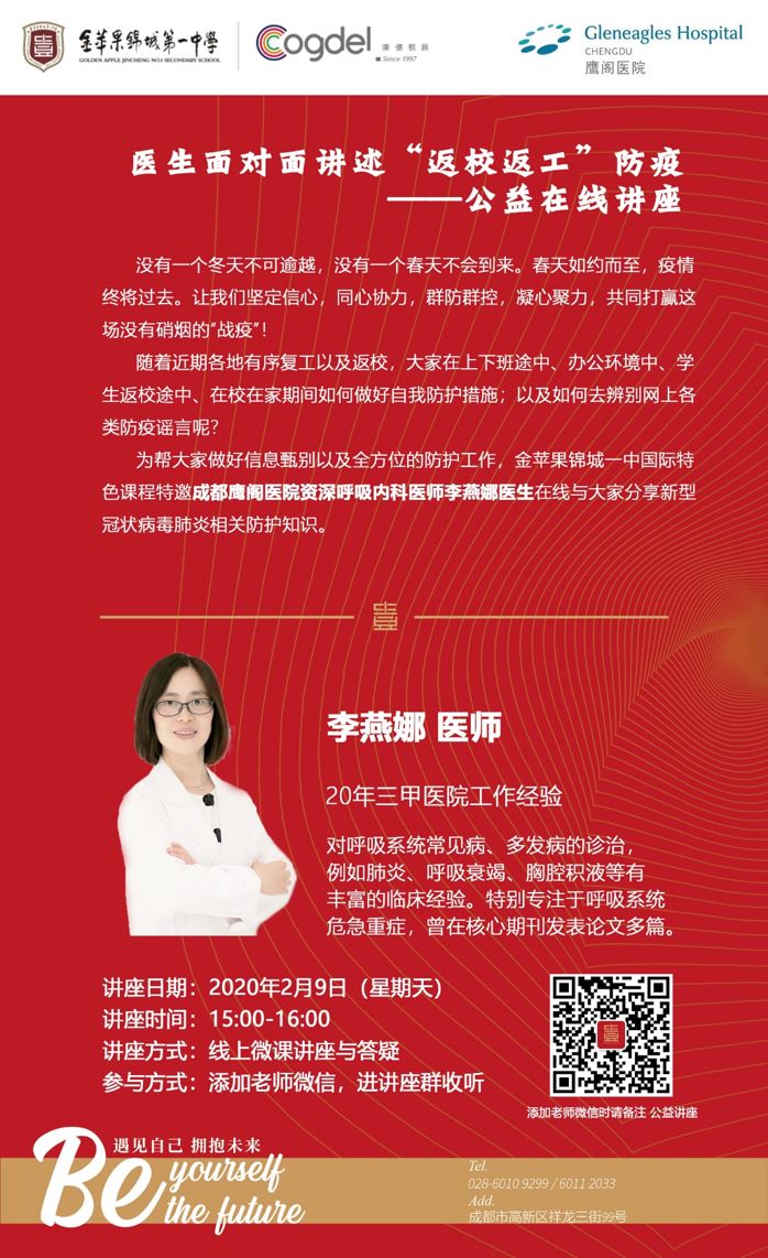锦城一中国际部(筹)在疫情发生的第一时间向学生、家长科普新冠居家防护、心理关护的正确“姿势“;同时,与家长建立有效沟通机制,密切关注学生每日健康情况。此外,学校特邀成都鹰阁医院(Gleneagles Hospital, Chengdu)资深呼吸内科医师李燕娜医生,于2020年2月9日为教师和学生家长在线分享新型冠状病毒肺炎相关防护知识。"Knowledge is the power- science popularization new epidemic prevention, guard you and me"