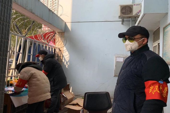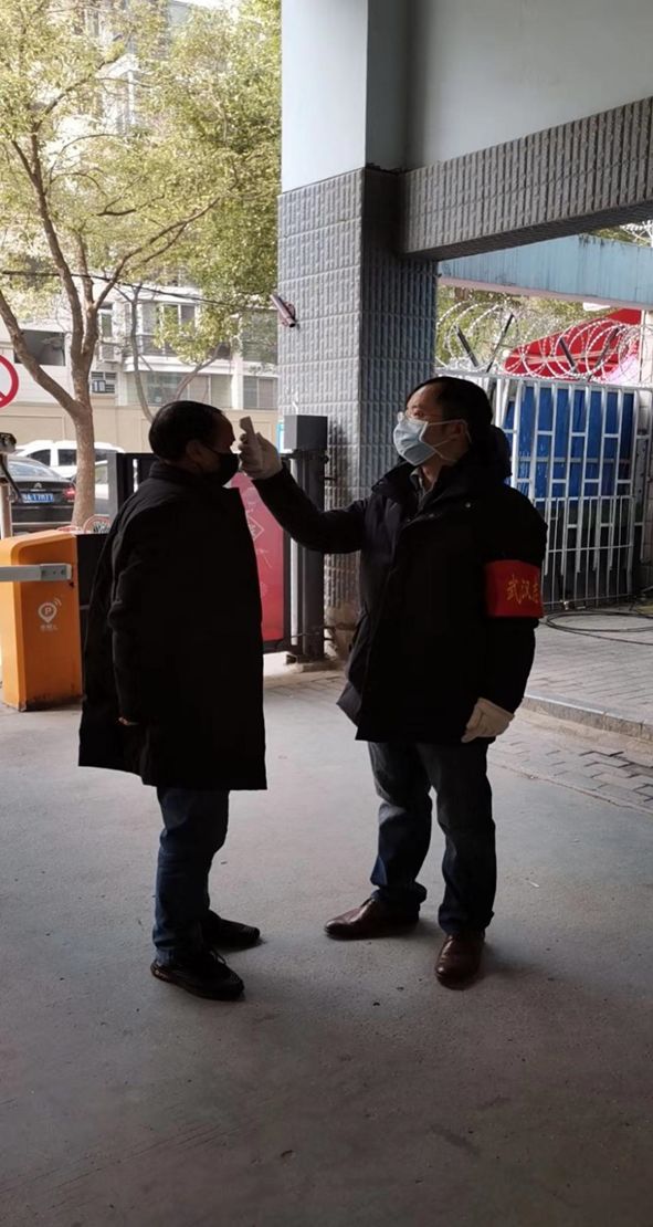 武汉六中特级教师、高二年级党支部书记徐涛为社区居民测体温