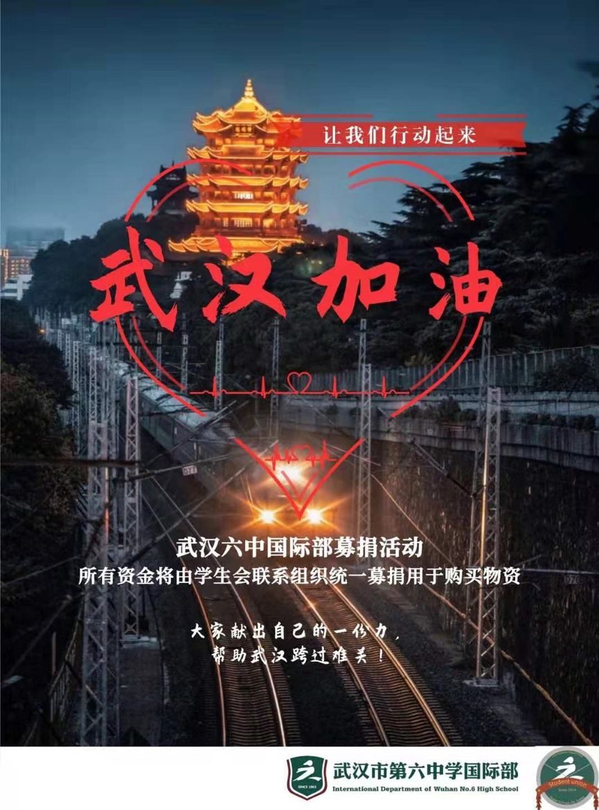 武汉六中国际部升学主任舒露老师积极参与宾夕法尼亚大学上海校友会志愿者活动,积极帮助境内外筹集采购捐赠急需医疗物资;与此同时,武汉六中国际部学生会自发策划、组织并征求学校、老师及家长的审核与同意后,通过学校官方微信平台进行募捐,为此次疫情防控战贡献自己力所能及的力量!共募集善款人民币64606元,康德教育总裁王舒先生以个人名义捐赠5万元,全部善款已捐赠至武汉市江岸区慈善会。