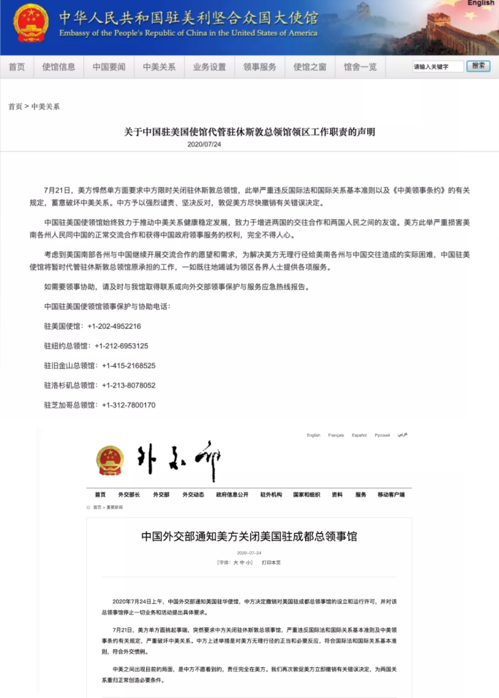 美国在当地时间7月21日无故单方面要求中国领馆在3天内撤离,此后北京时间7月25日晚间,中国驻美国大使馆发表《关于中国驻美国使馆代管驻休斯敦总领馆区工作职责的声明》。